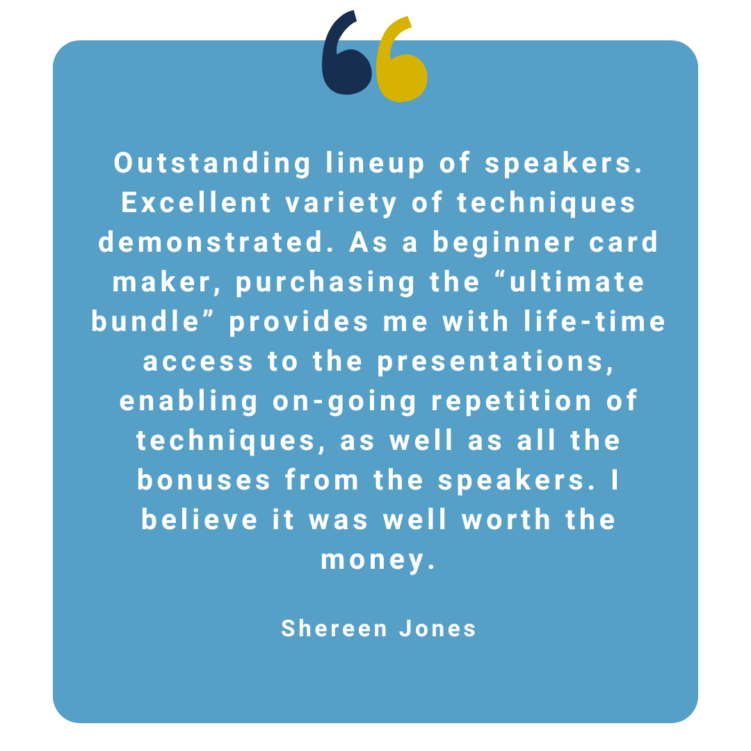 Upgrade your ticket to receive IMMEDIATE and lifetime access to the card tutorials, Q&A sessions, co-crafting sessions, resources, classes and seminars to ensure you have every tool you need to feel confident creating with your cardmaking stash